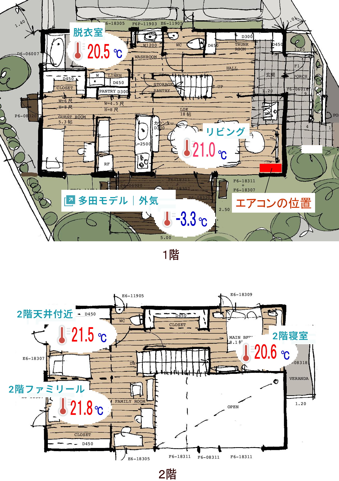 今回のデータでは、多田モデルハウスレベルの高断熱高気密住宅であれば、熱が奪われにくくほぼエアコンの設定温度が保たれることがお分かりいただけると思います。